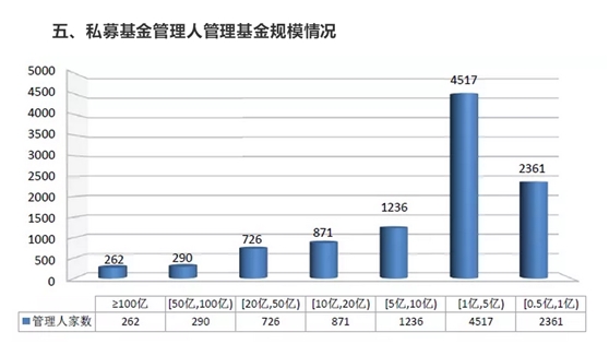 管理基金規(guī)模在20億—50億元的有726家,管理基金規(guī)模在10億—20億元的有871家,管理基金規(guī)模在5億—10億元的有1236家,管理基金規(guī)模在1億—5億元的有4517家,管理基金規(guī)模在0.5億—1億元的有2361家。截至2019年12月底,已登記的私募基金管理人有管理規(guī)模的共21306家,平均管理基金規(guī)模6.45億元。